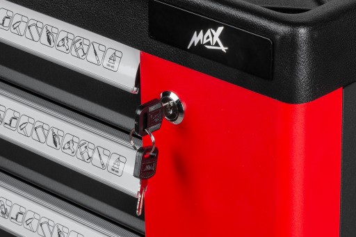 Wózek warsztatowy / szafka narzędziowa firmy MAX wyposażona w 7 mocnych, w pełni wysuwanych szuflad, które możemy zamknąć za pomocą zamka centralnego. W czterech szufladach znajdziemy zestaw 156 praktycznych narzędzi ułożonych tematycznie i odpowiednio oznaczonych. Pozostałe trzy szuflady możemy wykorzystać do przechowywania własnych narzędzi; bez problemu zmieścimy tam np. wiertarki, wkrętarki, klucze udarowe czy też inny osprzęt, który chcemy mieć w jednym miejscu.
