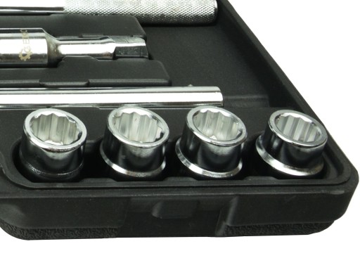 Zestaw kluczy nasadowych marki GEKO składający sie z 21 elementów. Zestaw zawiera pakiet nasadek 12-kątnych z gniazdem 3/4", pokrętło typu T (3/4"), grzechotkę (3/4") oraz zestaw przedłużek (3/4"). Wszystkie elementy zestawu wykonane są z wysokiej jakości stali chromowo-wanadowej CrV. Całość umieszczona jest w poręcznej walizce wykonanej z wytrzymałego tworzywa sztucznego. Charakterystyka produktu wszystkie elementy wykonano ze stali chromowo-wanadowej CrV całość zapakowano w solidną walizkę wykonaną z wytrzymałego tworzywa sztucznego solidna grzechotka i pokrętło na 3/4" zawiera pakiet nasadek 12-kątnych 3/4" Zawartość zestawu nasadki 12-kątne 3/4" w rozmiarach: 19, 21, 22, 23, 24, 26, 27, 30, 32, 34, 36, 38, 41, 46, 48, 50 mm grzechotka 3/4" pokrętło typu T 3/4" 2 przedłużki 3/4": 100 mm, 200 mm