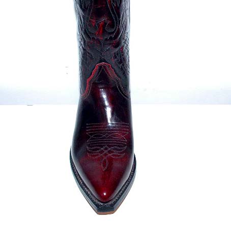 Piękny model długiego kowbojka. Całość wykonana z najlepszych skór. Kolor ciemnobordowy, cieniowany. Wierzch skóra lakierowana z haftami, wykończenie wnętrza-skóra, podeszwa-skóra, obcas - drewno. Ręczna robota. 'Original Goodyear welt'. Nowe, z oryginalnym pudłem.