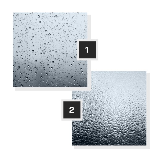 Nasze szyby posiadają powłokę ochronną gwarantującą skuteczne i długotrwałe zabezpieczenie odpornością hydrolityczną oraz utrzymanie wysokich walorów estetycznych wyrobu. Cienka warstwa polimerowa wypełnia mikroskopijne wgłębienia w szkle, co czyni je idealnie gładkim. Dzięki właściwościom hydrofobowym krople wody nie utrzymują się na powierzchni szkła, tylko spływają, redukując znacznie pozostawianie osadów (1. szkło z powłoką vs. 2. szkło bez powłoki).
