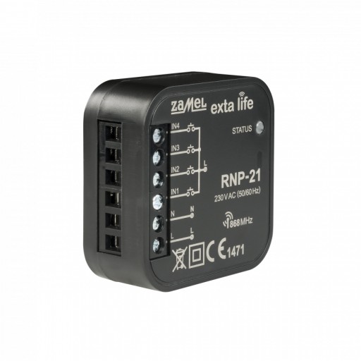 Nadajnik RNP-21 umożliwia bezprzewodowe sterowanie odbiornikami systemu EXTA LIFE. Przeznaczony jest do realizacji takich funkcji jak zdalne załączanie/wyłączanie oświetlenia, regulacja natężenia oświetlenia, zamykanie/otwieranie rolet okiennych i bram garażowych. Nadajnik dedykowany jest do montażu w puszkach podtynkowych (minimum ?60mm) pod istniejącym osprzętem. Pozwala to na wykorzystanie osprzętu elektroinstalacyjnego dowolnego producenta i nie powoduje ograniczeń w zakresie designu i charakteru wnętrz. Zasilanie urządzenia to napięcie sieciowe 230 V. Posiada cztery wejścia dzięki czemu możliwe jest niezależne sterowanie maksymalnie czterema odbiornikami (kanałami) systemu. Wbudowana dioda LED sygnalizuje transmisję, która jest kodowana co dodatkowo zapewnia bezpieczeństwo sterowania.