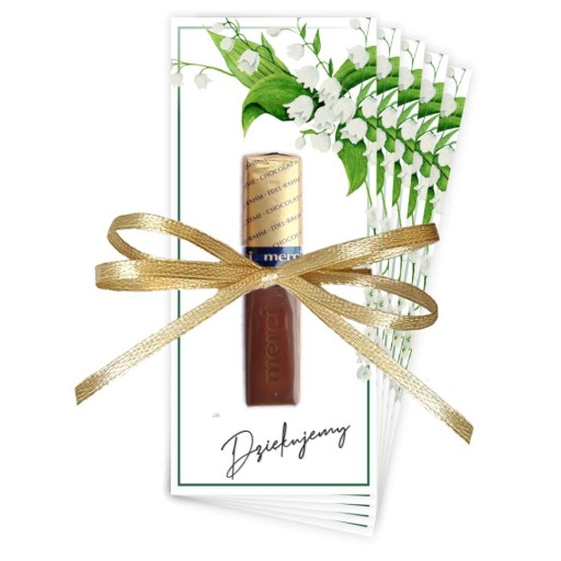 Małe podziękowanie dla Gości na uroczystości Pierwszej Komunii Świętej to bardzo znana i popularna tradycja. Zestaw zawiera 5 dwustronnych grubych tekturek z miejscem na wklejenie np. czekoladki Merci oraz 5 złotych satynowych tasiemek z których samodzielnie zawiążesz kokardki po przyklejeniu czekoladki. Na kartoniku obok motywu konwalii i zielonej ramki wydrukowany jest tekst "Pierwsza Komunia Święta". Takie podziekowanie zazwyczaj wręczane jest każdemu kto składa życzenia i wręcza np. telegram, czy kwiaty. Inną bardzo popularną formą jest rozłożenie podziękowań na uroczystym stole obok nakrycia każdego z Gości. Pozwala to na zajęcie Gości czymś przez kilka pierwszych chwil, które czasem owiane są niezręczną ciszą. Ponadto to rozwiązanie sprawia, że żaden z Gości nie zostanie pominięty :)