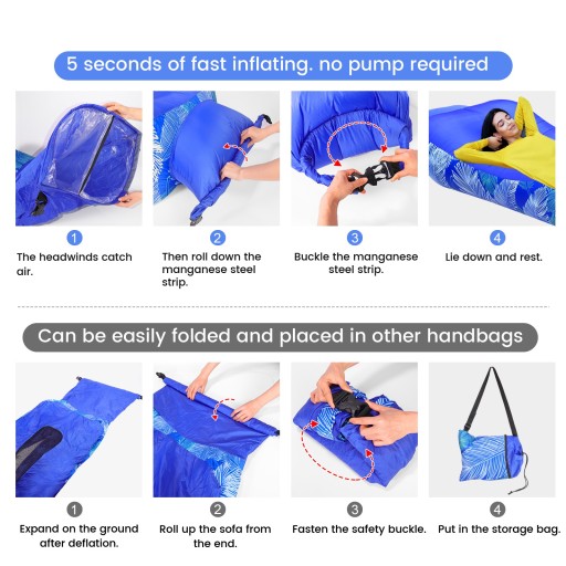 【Nie wymaga pompy, łatwe do napompowania】: naciśnij zatrzask bezpieczeństwa na klamrze, aby odblokować. Otwórz szeroko kieszeń kanapy i biegnij prosto pod wiatr, aby złapać powietrze (nie pompuj w kółko. Rotacja w miejscu nie może być pełna powietrza). Uwaga: musisz zatrzymać powietrze, zamykając otwór rękawa przed zakończeniem każdego ruchu i trzymać usta zamknięte do rozpoczęcia następnego ruchu. Następnie szybko zamknij kieszeń i zwiń ją tak ciasno, jak to możliwe, aż nie będzie można jej już zrolować. Zapnij klamrę zabezpieczającą i gotowe! Łatwiej będzie napompować w wietrzny dzień lub możesz poprosić o pomoc z wentylatorem, gdy jesteś w pomieszczeniu (Uwaga: BEZ PLASTIKOWEJ TABLICY).