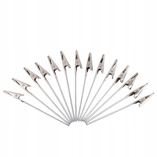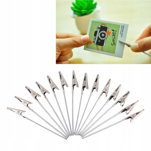 ◼️ Ten klips z drutu ma długą srebrną szyjkę i krokodylkowy klips na górze, który przypina kartę.