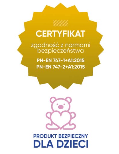 Masywna, atestowana konstrukcja gwarantuje bezpieczeństwo i dobrą zabawę nawet najmłodszym dzieciom. Mebel posiada certyfikaty potwierdzające zgodność z normami bezpieczeństwa.