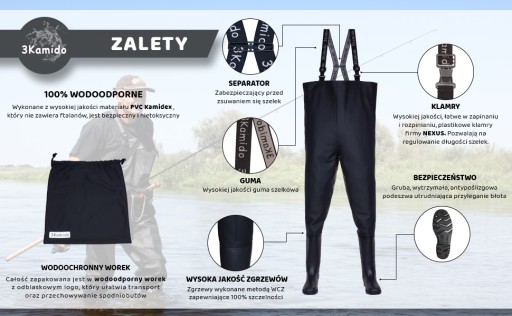 Spodniobuty 3Kamido "CLASSIC" w 100% chroniące przed wodą z wgrzanymi butami wysokiej jakości. Technika zgrzewania obustronnego WCZ zapewnia 100 % szczelność szwów.