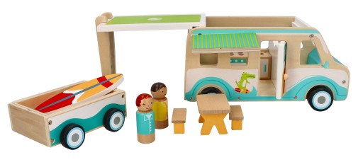 ADAMTOYS - DREWNIANY KAMPER Z PRZYCZEPKĄ I AKCESORIAMI