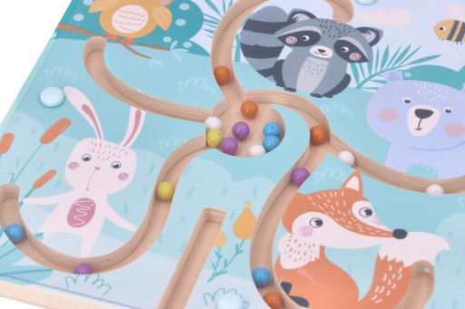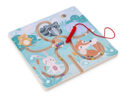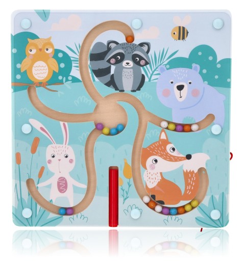 Magnetyczny labirynt to drewniana plansza ze ślicznym nadrukiem leśnych zwierząt, na którą nałożono przezroczystą szybkę z tworzywa. Połączone razem nie pozwalają na wysypanie się kulek na zewnątrz. Magnetyczna pałeczka dołączona do podstawy i połączona z nią sznureczkiem ma również swoje miejsce.