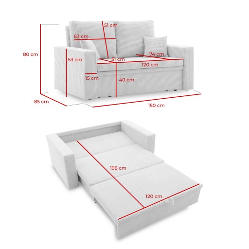 Idealnym rozwiązaniem w tym modelu jest funkcja spania. W sofie zastosowano wysuwany wózek, który pozwala przekształcić sofę w wygodne łóżko, dając powierzchnię spania wynoszącą 198 cm x 120 cm. Wewnątrz znajduje się pojemnik do przechowywania pościeli lub innych rzeczy, co pomoże w utrzymywaniu porządku.