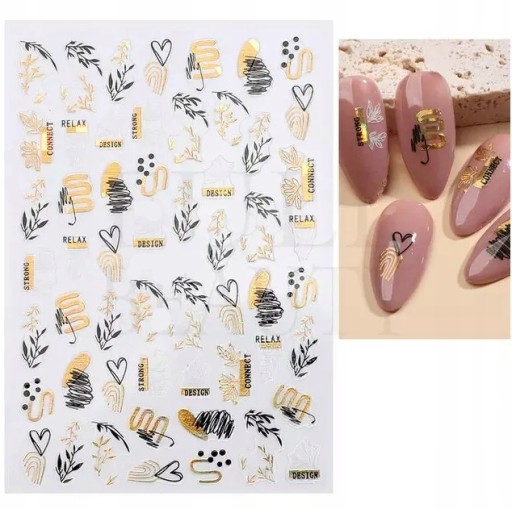✔️Delikatny wzór w czarno-biało-złotym kolorze. Złoty kolor jest holograficzny, mieni się pod wpływem światła.Najlepiej prezentuje się na jasnych, pastelowych paznokciach.