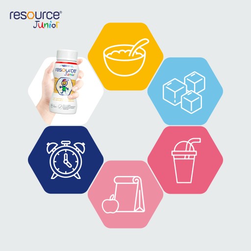 To kompletna pod względem odżywczym, wysokoenergetyczna dieta w płynie przeznaczona dla dzieci powyżej 1. roku życia. Skonsultuj z lekarzem wprowadzenie do diety produktu Resource Junior.