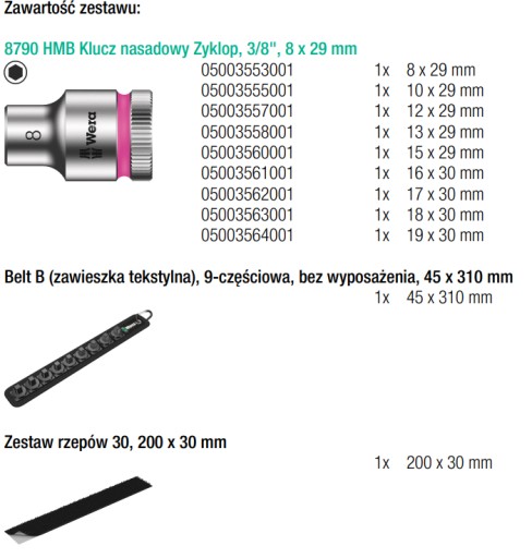 - Wytrzymała zawieszka tekstylna wykonana w stylu charakterystycznym dla firmy Wera z 9 kluczami nasadowymi i narzędziem do usuwania nakrętek do pracy w ograniczonych przestrzeniach.