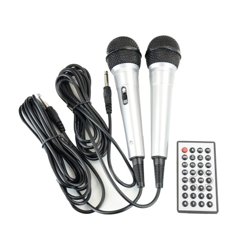 - W zestawie 2 mikrofony przewodowe oraz pilot zdalnego sterowania