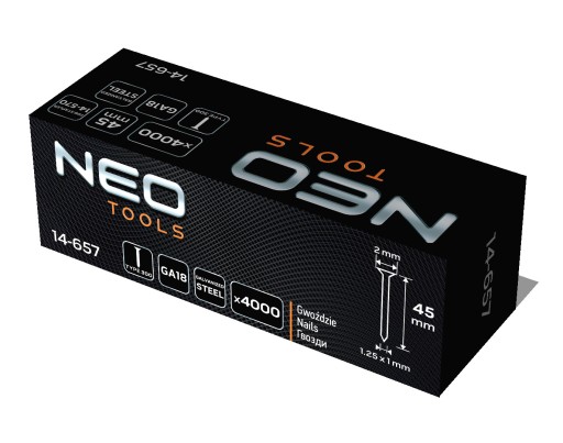 Gwoździe galwanizowane do zszywacza pneumatycznego (14-570), GA18, Typ 300 (F), długość 45 mm, 4000 sztuk 14-657 marki NEO to gwoździe stalowe, galwanizowane, a tym samym odporne na korozję.
