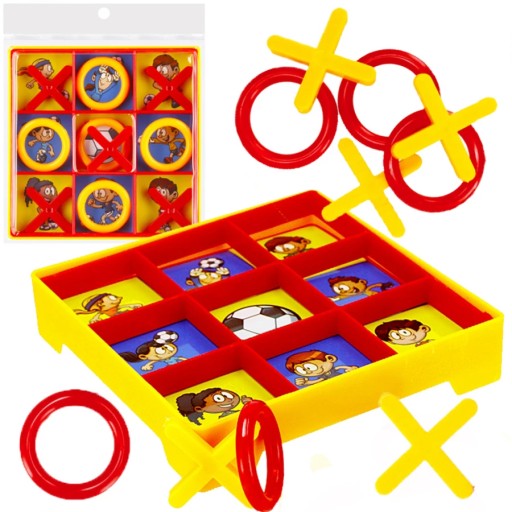W zestawie znajduje się plansza podzielona na 9 kwadratowych pól, 5 plastikowych kształtów w formie krzyżyka i 5 kształtów w formie kółka.