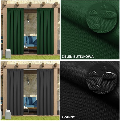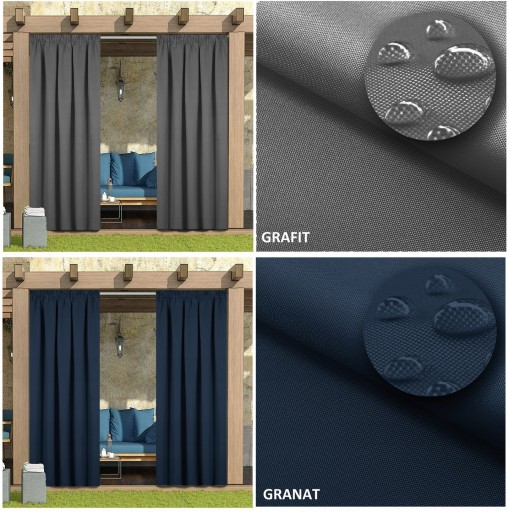 Wodoodporność i ochrona przed słońcem: Nasze zasłony zewnętrzne ze specjalną obróbką materiału są odporne na wodę. Te wodoodporne zasłony są trwałe nawet podczas deszczu, wiatru lub światła słonecznego. Zasłony są doskonałej jakości a tkanina użyta przy produkcji blokuje większość światła słonecznego i promieni UV. Zapobiega zamoczeniu w deszczowe dni lub poparzeniom w słoneczne dni. Im ciemniejszy kolor, tym lepszy efekt cieniowania