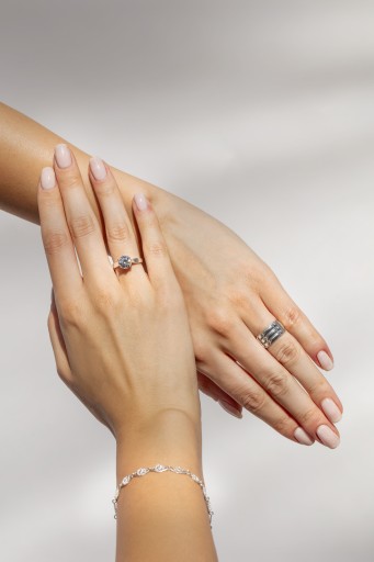 Pierścień składający się z trzech umieszczonych na środku prostokątów, na których przedłużeniu, po każdej stronie, znajdują się trzy kwadraty oraz trójkąt równoboczny. Pierścionek z otwartą obrączką, dzięki czemu można go delikatnie regulować.