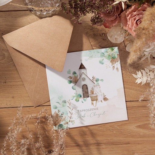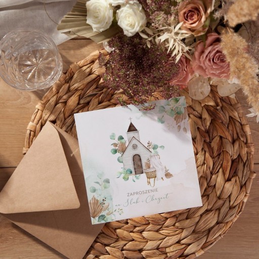 Przepiękne zaproszenia na Chrzest Święty dziecka i Ślub. Produkt wykonany ze sztywnego papieru w delikatnej kolorystyce. Zaproszenia do samodzielnego wypisania w komplecie mają dołączone białe koperty. Urocza grafika przedstawiająca kościół, kołyskę oraz gałązki eukaliptusa w stylu boho. Powiadom o ważnym dniu najbliższe osoby wybierając oryginalne zaproszenia.