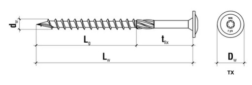 - Łeb podkładkowy z gniazdem TORX. Łeb podkładkowy zwiększa powierzchnię docisku zapewniając wysoką wytrzymałość na przeciąganie. Gniazdo TORX gwarantuje optymalne przeniesienie momentu obrotowego.