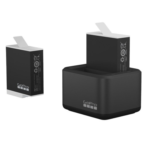 Wygodne ładowanie dwóch akumulatorów GoPro jednocześnie i dodatkowe zasilanie kamery. Ten zestaw zawiera podwójną ładowarkę i dwie zaawansowane baterie Enduro, które zapewniają znacznie dłuższy czas pracy i znacznie lepszą wydajność w niskich temperaturach w porównaniu ze standardowymi bateriami GoPro.