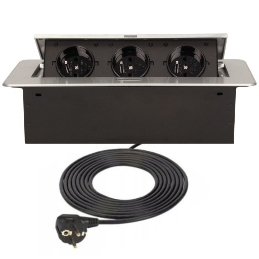 ✅ Konstrukcja składa się z obudowy, którą należy zamontować w blacie o grubości min. 25 mm oraz górnego panelu w którym schowane są 3 gniazda z uziemieniem (typ french - z bolcem).