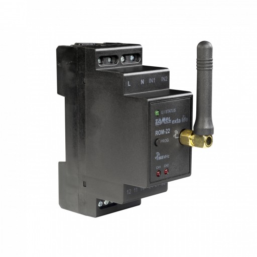 Radiowy odbiornik modułowy ROM-22 to element końcowy systemu EXTA LIFE, który umożliwia niezależne sterowanie dwoma dowolnymi urządzeniami / obwodami. Wyjścia stanowią dwa przekaźniki ze stykami przełącznymi (NO/NC) o maksymalnej obciążalności 10A. Daje to możliwość sterowania obwodami niskonapięciowymi (na przykład 12/24 V AC/ DC) oraz wysokonapięciowymi (230 V AC). Odbiornik sprawdza się także przy zdalnym wyzwalaniu innych urządzeń. Z powodzeniem można go wykorzystać przy podawaniu sygnałów sterujących. ROM-22 nadaje się także do sterowania elektrozaworami w systemach ogrzewania. Komunikacja dwukierunkowa pomiędzy odbiornikiem a kontrolerem sprawia, iż aktualny stan każdego kanału odbiornika jest wskazywany w aplikacji mobilnej. Dzięki komunikacji dwukierunkowej możliwa jest także zmiana wybranych parametrów odbiornika oraz zdalne dopisywanie nadajników (bez dostępu do odbiornika). Algorytm kodowania ramek zapewnia bezpieczeństwo sterowania. Odbiornik poza kontrolerem może być równolegle sterowany z poziomu nadajników systemu EXTA LIFE. Do odbiornika można wpisać większą liczbę nadajników co daje możliwość niezależnego sterowania z kilku miejsc. Konfigurowalne wejścia przewodowe zwiększają funkcjonalność sterowania. Odbiornik posiada zaimplementowaną funkcję zdalnej aktualizacji oprogramowania z poziomu kontrolera. Urządzenie przeznaczone jest do montażu w szafach rozdzielczych na szynie TH35 (DIN). Odkręcana antena umożliwia dołączenie anteny zewnętrznej.
