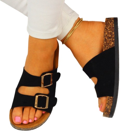 Damskie klapki w kolorze czarnym zapinane na dwie klamry. Sprawdzą się idealnie jako obuwie na co dzień. Będą odpowiednie na ciepłe, wiosenne i letnie, upalne dni. Pasują do wielu stylizacji. Płaska, korkowa podeszwa oraz profilowana wkładka zapewniają komfort i wygodę użytkowania. Wykończone zamszowym materiałem.