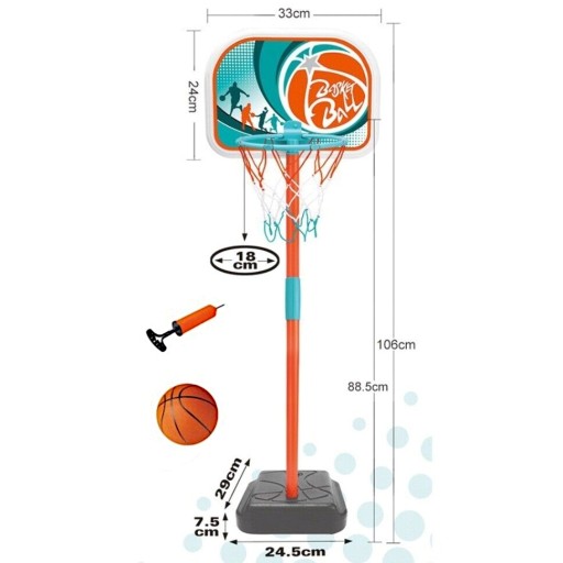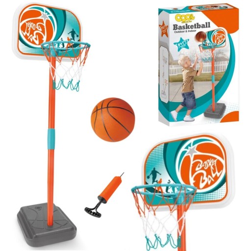 Kolorowa tablica do kosza zamontowana jest na stojaku, który stabilizuje podstawa. Podstawę napełniamy wodą lub piaskiem dla zapewnienia stabilizacji kosza. Grę/zabawę można rozpocząć od razu po złożeniu zestawu, ponieważ dołączona jest do niego piłka oraz pompka.