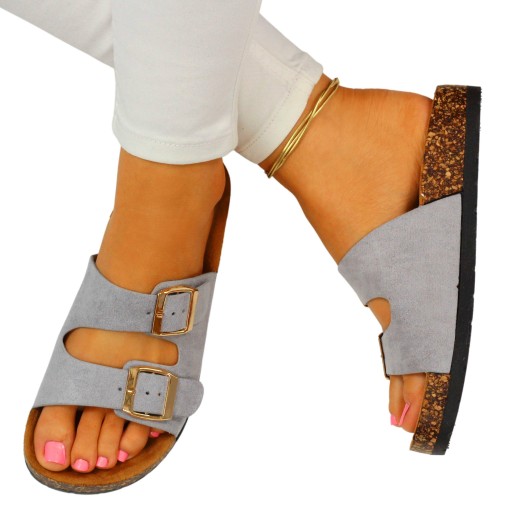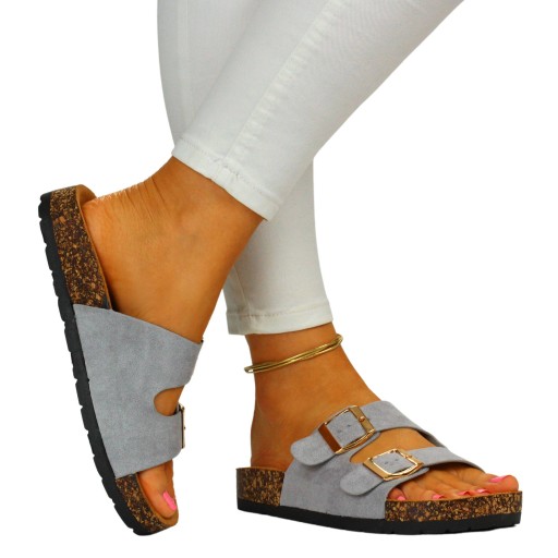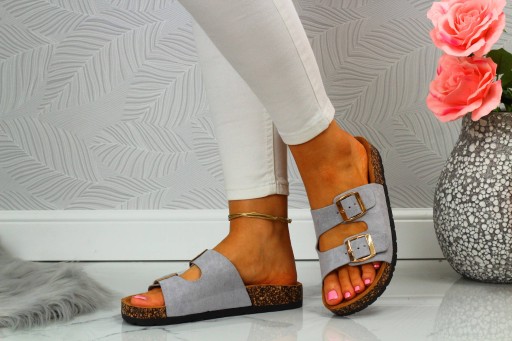 Damskie klapki w kolorze szarym zapinane na dwie klamry. Sprawdzą się idealnie jako obuwie na co dzień. Będą odpowiednie na ciepłe, wiosenne i letnie, upalne dni. Pasują do wielu stylizacji. Płaska, korkowa podeszwa oraz profilowana wkładka zapewniają komfort i wygodę użytkowania. Wykończone zamszowym materiałem.