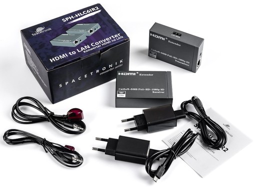Przedłużacz sygnału HDMI Spacetronik SPH-HLC6IR. Urządzenie umożliwia podłączenie sygnału wysokiej rozdzielczości (HD) do odbiornika (telewizor, monitor, itp.) wyposażonego w złącze HDMI poprzez skrętkę komputerową kat. 6 lub wyższej. W zestawie znajduję się nadajnik (TX) oraz odbiornik (RX). Dodatkową zaletą urządzenia jest przesyłanie funkcji pilota za pomocą dołączonych podczerwieni IR. Urządzenie przesyła sygnał HDMI 1080p na odległość 60 metrów.