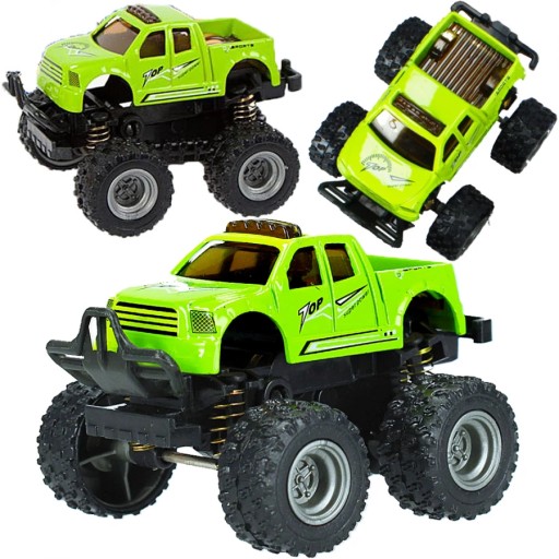 Zalety produktu: Terenówka posiada funkcję pull back, dzięki czemu po pchnięciu pojazdu do przodu, kontynuuję jazdę samodzielnie, posiada duże terenowe koła.