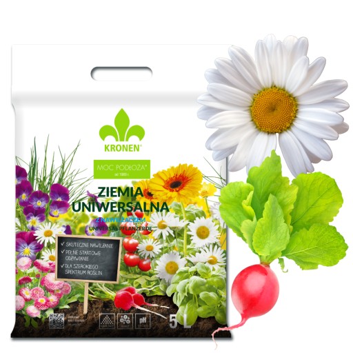 ☘️KRONEN® Ziemia uniwersalna z nawilżaczem jest przeznaczona do sadzenia i przesadzania wielu gatunków roślin zielonych i kwitnących, warzyw, ziół, bylin, iglaków w domach na balkonach, tarasach i w ogrodach, z wyjątkiem roślin kwaśnolubnych.