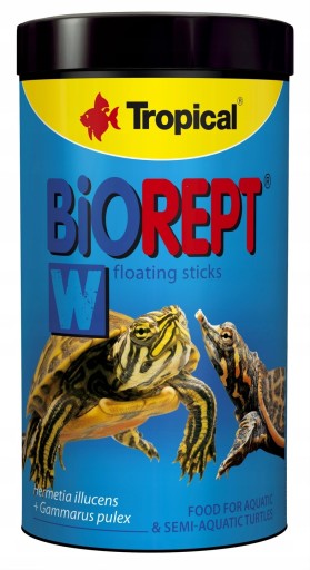 BIOREPT W wieloskładnikowe pałeczki dla żółwi wodnych. Wieloskładnikowy pokarm w formie pałeczek do codziennego karmienia żółwi wodnych i błotnych, zamieszkujących akwaterraria. Specjalnie dobrana kompozycja wyselekcjonowanych surowców naturalnych zabezpiecza potrzeby pokarmowe żółwi. Szczególną uwagę zwraca dodatek skorupiaków, w tym gammarusa i kryla, które są źródłem cennego białka, kwasów omega-3 i omega-6 oraz chityny, regulującej pracę przewodu pokarmowego. Znakomity smak pałeczek sprawia, że zwierzęta bardzo chętnie je zjadają. Odpowiednio dobrana kompozycja składników mineralnych oraz dodatek witaminy D3 zapewniają prawidłowy rozwój kośćca i skorupy żółwi, zapobiegając deformacjom i innym poważnym problemom zdrowotnym. Żółwie karmione regularnie pałeczkami BIOREPT W równomiernie się rozwijają i mają doskonałą kondycję.