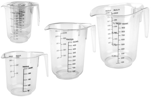 - z uchwytem i dziubkiem do odmierzania wody cukru, mąki