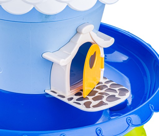 Na górze zabawki umieszczony został grzybek, który doskonale nawodni nasze roślinki. Wystarczy wlać do niego wodę aby zobaczyć prawdziwą fontannę. Zakończenie / obramówka górnej doniczki to tunel, do którego po wlaniu wody zobaczymy podobny efekt. Woda ścieknie na dół 4 otworkami i nawodni niższy poziom.