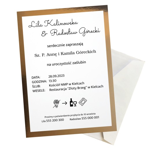 Zaproszenie jest wykonane na białym satynowym papierze i podklejone na papierze ZŁOTE LUSTRO