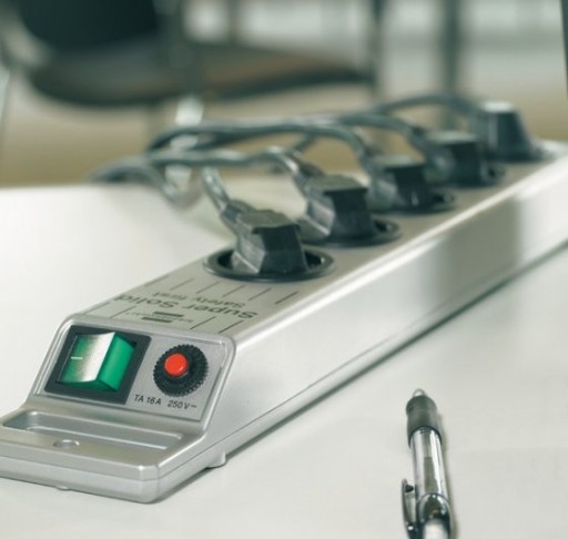 Listwa zasilająca przeciwprzepięciowa z praktycznymi oczkami mocującymi do montażu na ścianie i gumowymi nóżkami dla pewnej podstawy