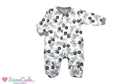 Pajacyk został wykonany w Polsce z bardzo miękkiej i przyjemnej w dotyku tkaniny bawełnianej (100% bawełna). Białe ubranko zostało ozdobione traktorkowym printem, ulubionym motywem wszystkich małych chłopców. Pajacyk jest rozpinany z przodu po całej długości, aż do stópek na antyalergiczne i bezniklowe napki. Rękawki oraz podkrój szyjki wykończono szarym ściągaczem, utrzymującym ubranko na swoim miejscu.