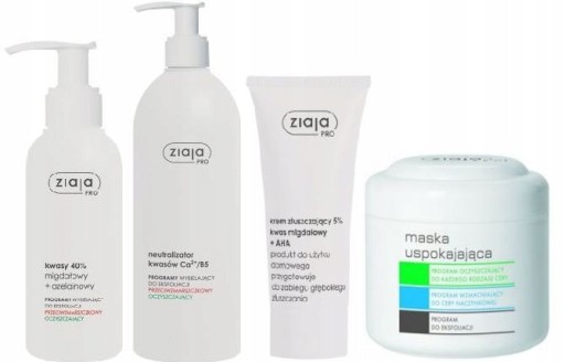 Program oparty na działaniu kompleksu kwasów migdałowego i azelainowego o łącznym stężeniu 40% i pH 1,0 -2,0. Kwas migdałowy należy do grupy AHA, działa złuszczająco i antybakteryjnie, wygładza naskórek oraz wpływa na regenerację skóry. W zabiegu eksfoliującym Ziaja PRO zastosowano odmianę lewoskrętną kwasu migdałowego (L-kwas migdałowy), która nie podrażnia skóry i nie wywołuje odczucia „szczypania” skóry. Kwas azelainowy – działa antybakteryjnie, redukuje zaskórniki, zmniejsza trądzik, wygładza i nawilża skórę.