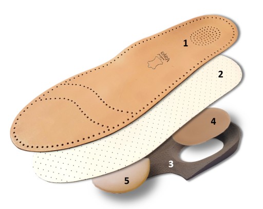 - Spodnia warstwa - anatomicznie wyprofilowany element odpowiednio podpierający stopę, rozluźnia mięśnie, minimalizuje ból i dyskomfort.