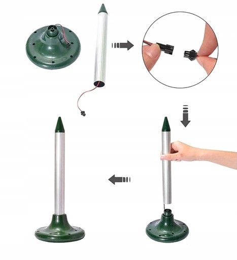 ✅ 3) W centrum obszaru, z którego chcemy pozbyć się kretów i gryzoni wykopać otwór i wsunąć do niego urządzenie tak, aby panel wystawał 3-5 cm nad ziemię. Nie wbijać urządzenia bezpośrednio w ziemię, ponieważ może ono ulec uszkodzeniu. Ziemia wokół urządzenia powinna ściśle przylegać do korpusu, co pozwoli urządzeniu skutecznie pracować.