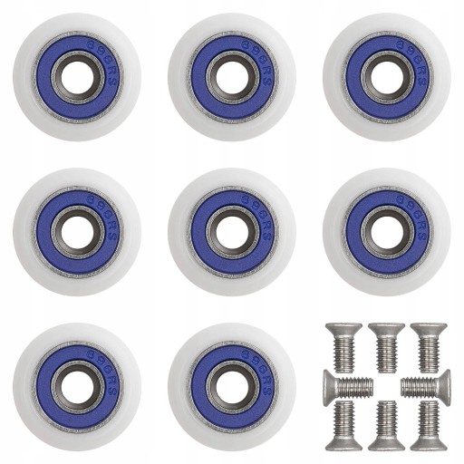 Ten model kółek posiada łożysko kulkowe wykonane ze stali nierdzewnej. Dzięki temu ich żywotność jest znacznie wyższa niż produktów z budżetowym łożyskiem. Zestaw zawiera osiem sztuk kółek oraz osiem śrub montażowych. Tworzywo z którego wykonane jest kółko sprawia że drzwi w kabinie przesuwają się cicho i bardzo płynnie.