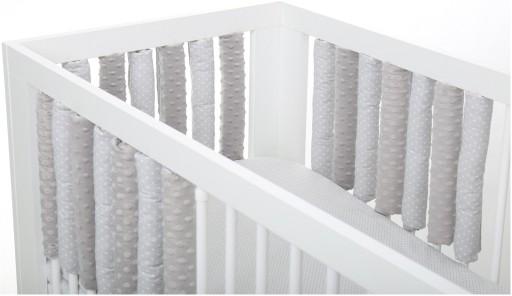 - Ochraniacz modułowy zakładany na pojedyncze szczebelki wypełniony jest puszystą kulką silikonową, która tworzy otulającą, miękką, amortyzującą osłonę wokół szczebelków. Takie rozwiązanie chroni delikatną główkę i ciało dziecka przed uderzeniem w twarde szczebelki łóżeczka.