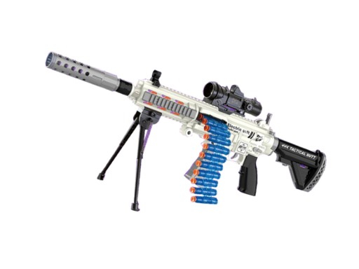 Zawartość zestawu: Karabin Tactic Blaster, luneta, celownik, dwójnóg, magazynek taśmowy na 26 pocisków, 30 pocisków (strzałek), ładowarka USB, akumulator, dwie lufy (krótka i długa)