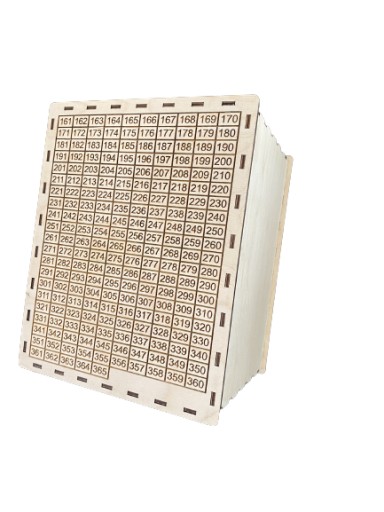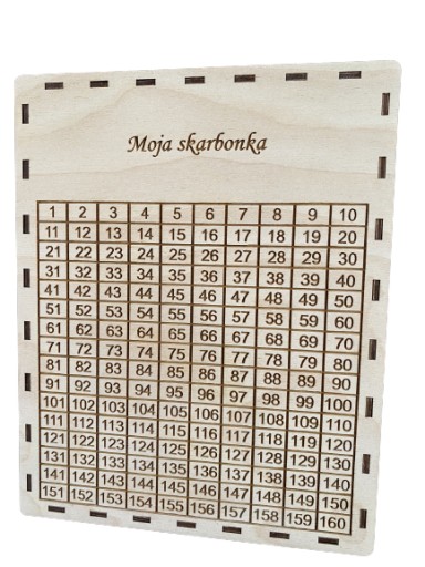 Skarbonka wykonana ze sklejki brzozowej 3mm. Na niej znajdują się liczby od 1 do 365, które oznaczają każdy dzień w roku. Sugerowane oszczędzanie polega na wrzucaniu do niej pieniędzy każdego dnia: takiej kwoty, jaki jest z kolei dzień i skreślaniu tego dnia na skarbonce ( 1 dzień-1zł, 20 dzień-20zł, 26 dzień-26zł itd). Poprzez taką metodę po roku czasu w skarbonce uzbiera się aż