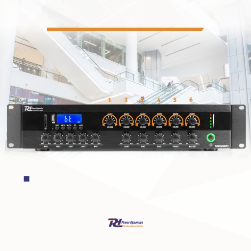 Do użytku w systemach dźwiękowych 100V. Wzmacniacz 100V ma 6 stref, które można indywidualnie regulować pod względem głośności, co ułatwia tworzenie wielostrefowego systemu dźwiękowego. Wzmacniacz wyposażony jest w Bluetooth, wbudowany odtwarzacz MP3 oraz radio FM. W przypadku systemów dźwiękowych, w których pożądana jest również opcja nadawania, jest on wyposażony w 2 wejścia mikrofonowe. Wzmacniacz posiada 2 wejścia liniowe do podłączenia dodatkowego sprzętu audio. Dzięki wyjściu liniowemu możliwe jest zapętlenie sygnału do drugiego wzmacniacza. Krótko mówiąc, z PDW360 masz bardzo rozbudowany wzmacniacz do wielu zastosowań.