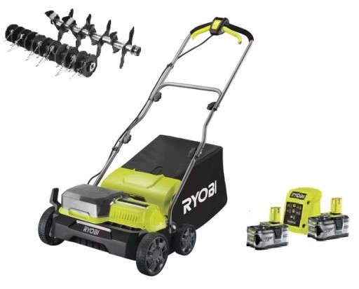 - W zestawie: 2 x akumulator 4,0 Ah, ładowarka, kosz, wałek do wertykulacji, wałek do aeracji