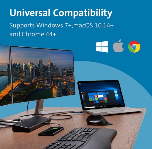 - Technologia połączenia: USB-C lub USB-A (DisplayLink) Zasilanie: obsługuje USB-C PD 3.0 (85W ładowania laptopa)