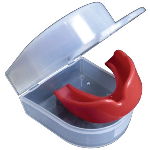 Pojedynczy jednowarstwowy ochraniacz na zęby w komplecie z zamykanym plastykowym pudełkiem.