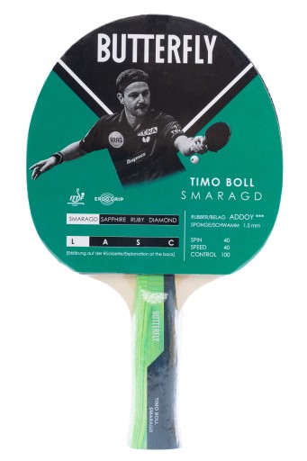 BUTTERFLY Timo Boll Smaragd to rakietka przeznaczona na pierwsze doświadczenia klubowe dla zawodników z rosnącymi ambicjami, którzy chcą polepszyć swoją grę. Zatwierdzona przez ITTF guma Addoy z 1,5 mm z gąbką oraz technologia Ergo Grip.